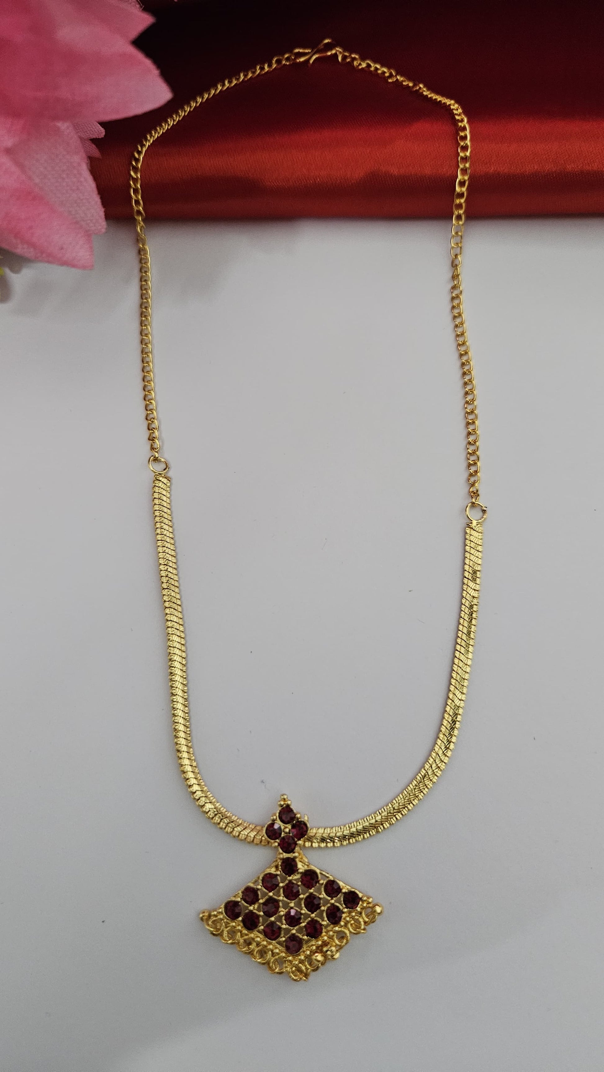 Step into timeless elegance with this stunning gold-toned necklace featuring a uniquely shaped pendant encrusted with deep ruby-red stones. Crafted with intricate filigree detailing and a radiant finish, the pendant’s symmetrical design adds a bold yet graceful charm to any traditional outfit.